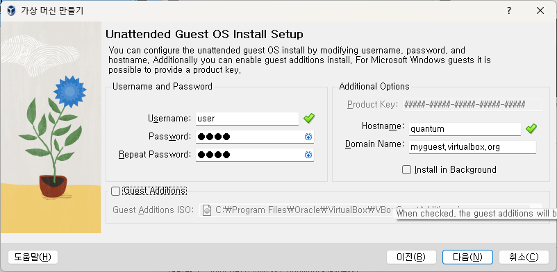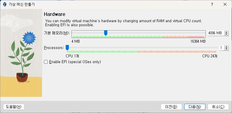 ์ดํ ๋ค์๊ณผ ๊ฐ์ด ์ค์ ํ๊ณ Finish ๋ฒํผ์ ๋๋ฌ VM ์ค์น๋ฅผ ๋ง๋ฌด๋ฆฌํ๋ค. ์ค์ ๊ฐ์ ๊ฐ์ธ์ด ์ํ๋ ๋๋ก ์ค์นํ๋ฉด ๋จ.