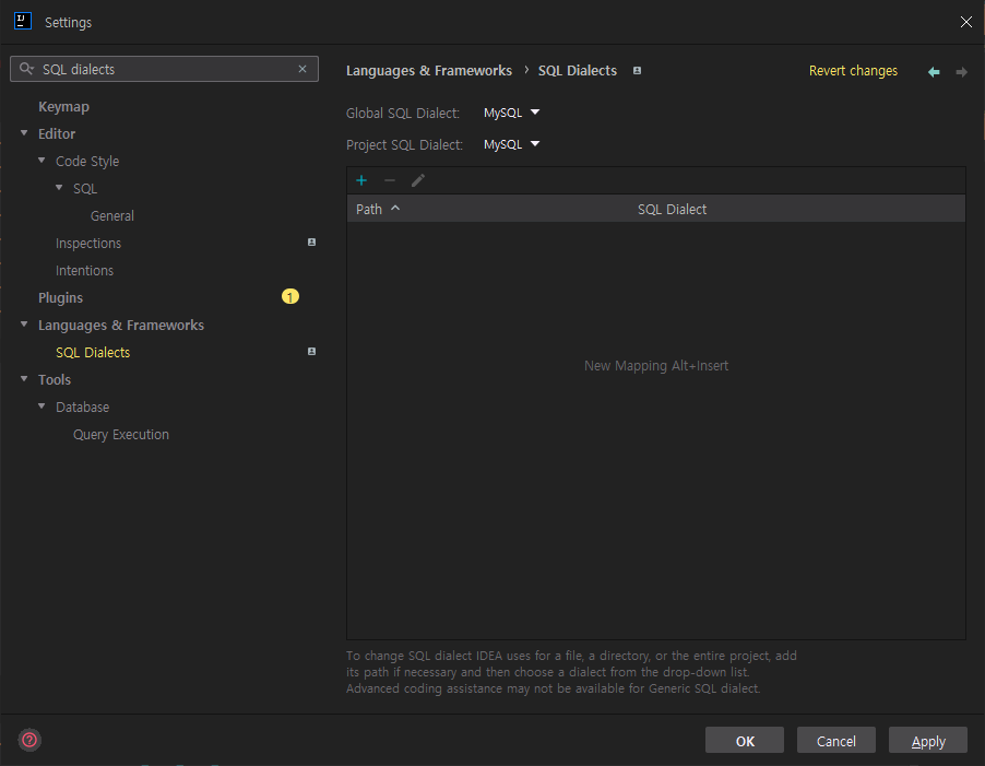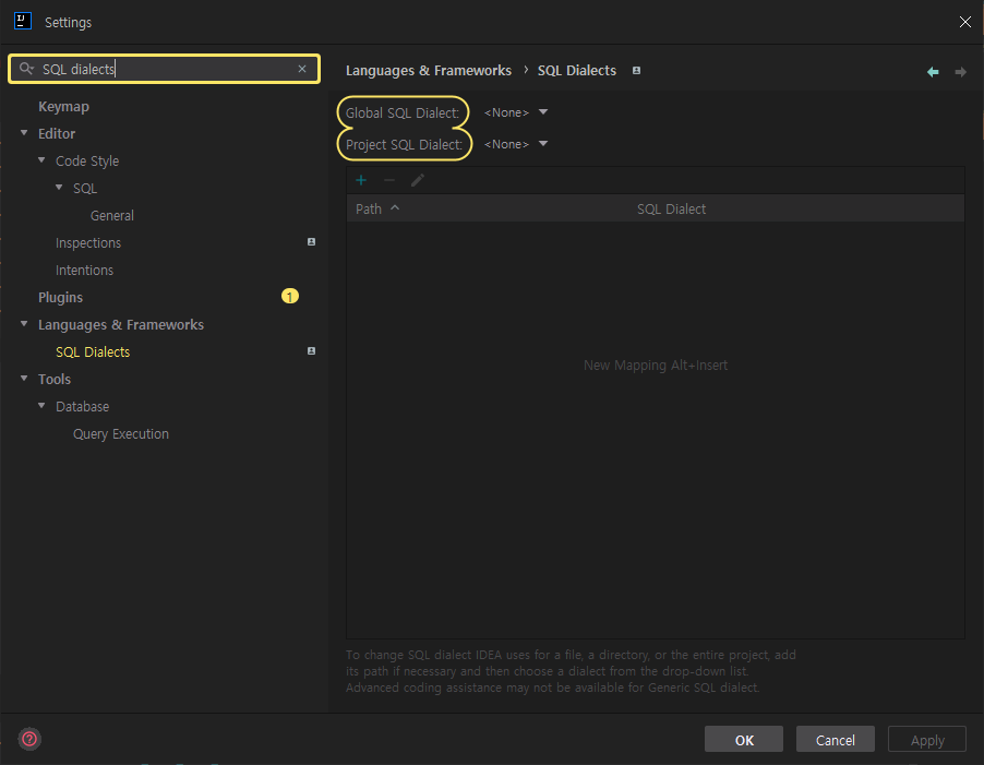 Setting - Project Setting - SQL dialects ํญ๋ชฉ์ ์ฌ์ฉํ๋ DBMS(MySQL, Oracle ๋ฑ)์ ์ ์ ํ ์ ํํ๋ฉด ํด๊ฒฐ๋๋ค.