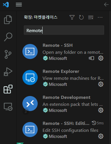 VSCode๋ฅผ ์คํํ๋ฉด ์ข์ธก์ ๋์ด๋๋ ์์ด์ฝ ์ค ํ์ฅ ์์ด์ฝ์ ํด๋ฆญํ๊ณ Remote๋ฅผ ๊ฒ์ํ๋ค.