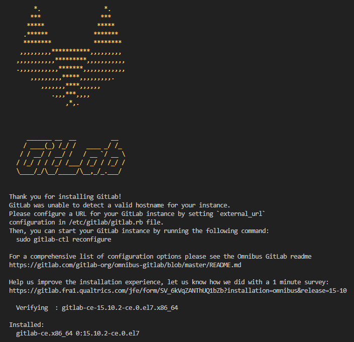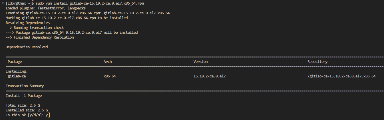 $ sudo yum install gitlab-ce-15.10.2-ce.0.el7.x86_64.rpm