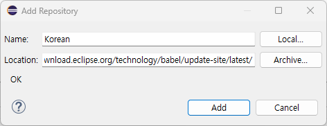 Zip ํ์ผ์ ์ง์ ๋ค์ด๋ก๋ํด๋ ๋๊ณ , ๋งํฌ๋ฅผ ๋ณต์ฌํด์ Installํด๋ ๋๋ค. ๋ค์ด๋ก๋ ํ์ผ์ ๋จ๊ธฐ๊ธฐ ์ซ๋ค๋ฉด ๋งํฌ๋ฅผ ๋ณต์ฌํด์ ํ๋ ๊ฒ ๋ ์ข๊ฒ ์ง? Babel Language Pack Update Site for Latest Release ์๋์ ๋งํฌ๋ฅผ ๋ณต์ฌํด์ค๋ค.