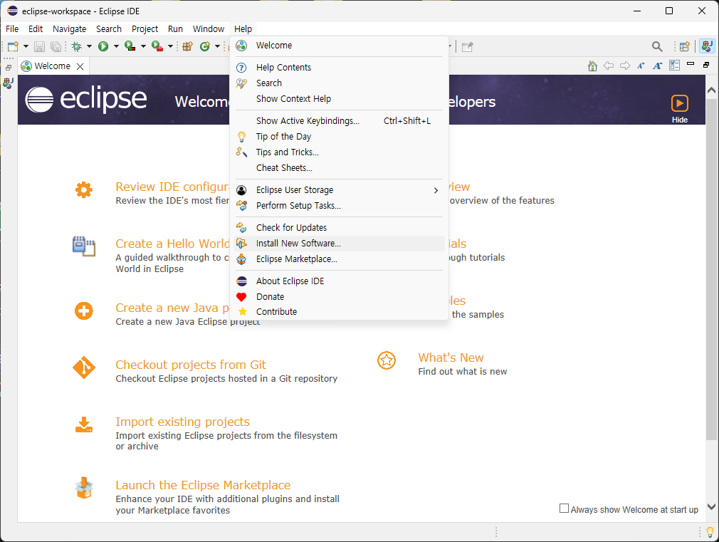 ๊ทธ๋ฆฌ๊ณ Eclipse์์ Help > Install New Software... ํด๋ฆญ