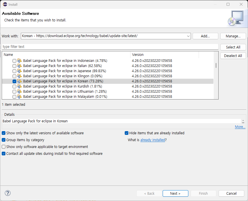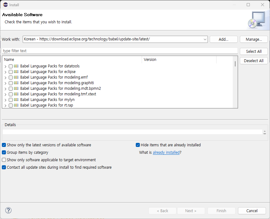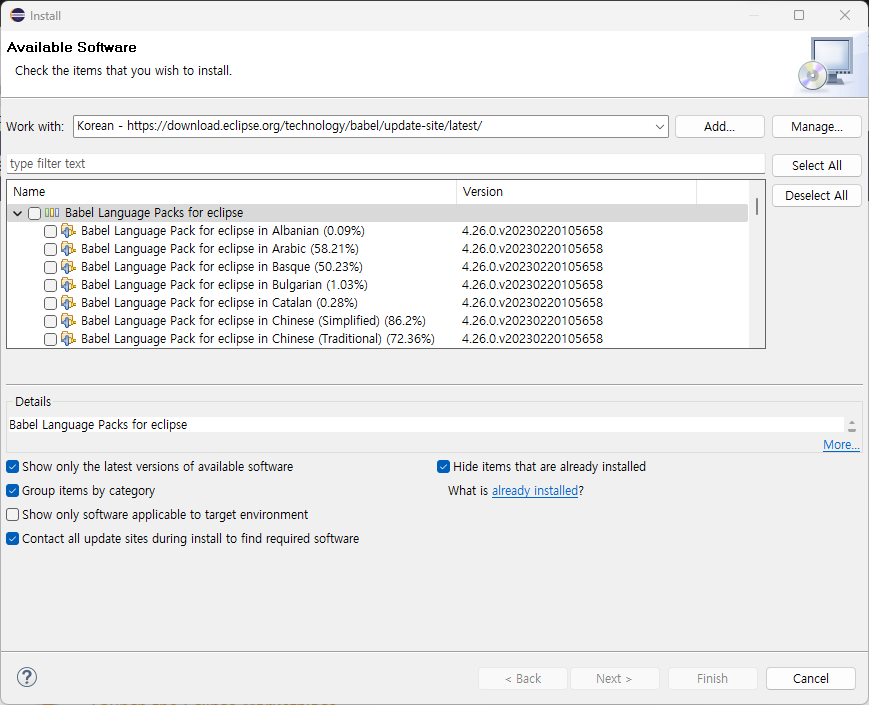 - Eclipse ํ๊ตญ์ด ํจ์น ๋ค์ด๋ก๋ : https://eclipse.dev/babel/downloads.php