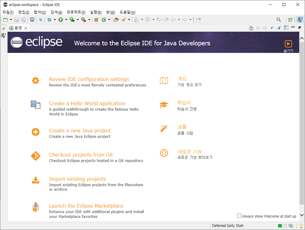 Eclipse๋ ์์์ ๋งํ ๊ฒ ์ฒ๋ผ ๊ธฐ๋ณธ์ด ์๋ฌธ์ด๋ผ ํ๊ตญ์ด๋ฅผ ์ฌ์ฉํ๊ณ ์ถ๋ค๋ฉด ํ๊ตญ์ด ํจ์น๋ฅผ ์งํํด์ผ ํ๋ค.