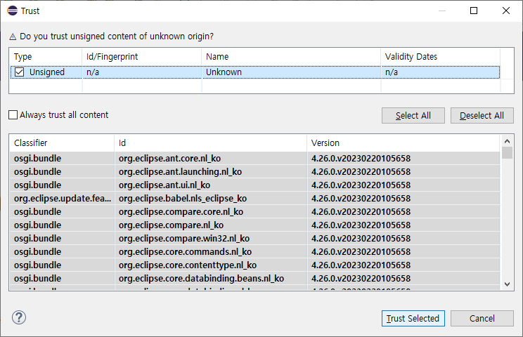 ์๋ ํจํค์ง๋ค์ ํ์ฉํ ๊ฑฐ๋๊ณ ๋ฌป๋๋ฐ, ์ค์น๋ฅผ ๊ณ์ ์งํํด์ผํ๋๊น ์ฒดํฌํด์ค ๋ค Trust Selected ํด๋ฆญ.